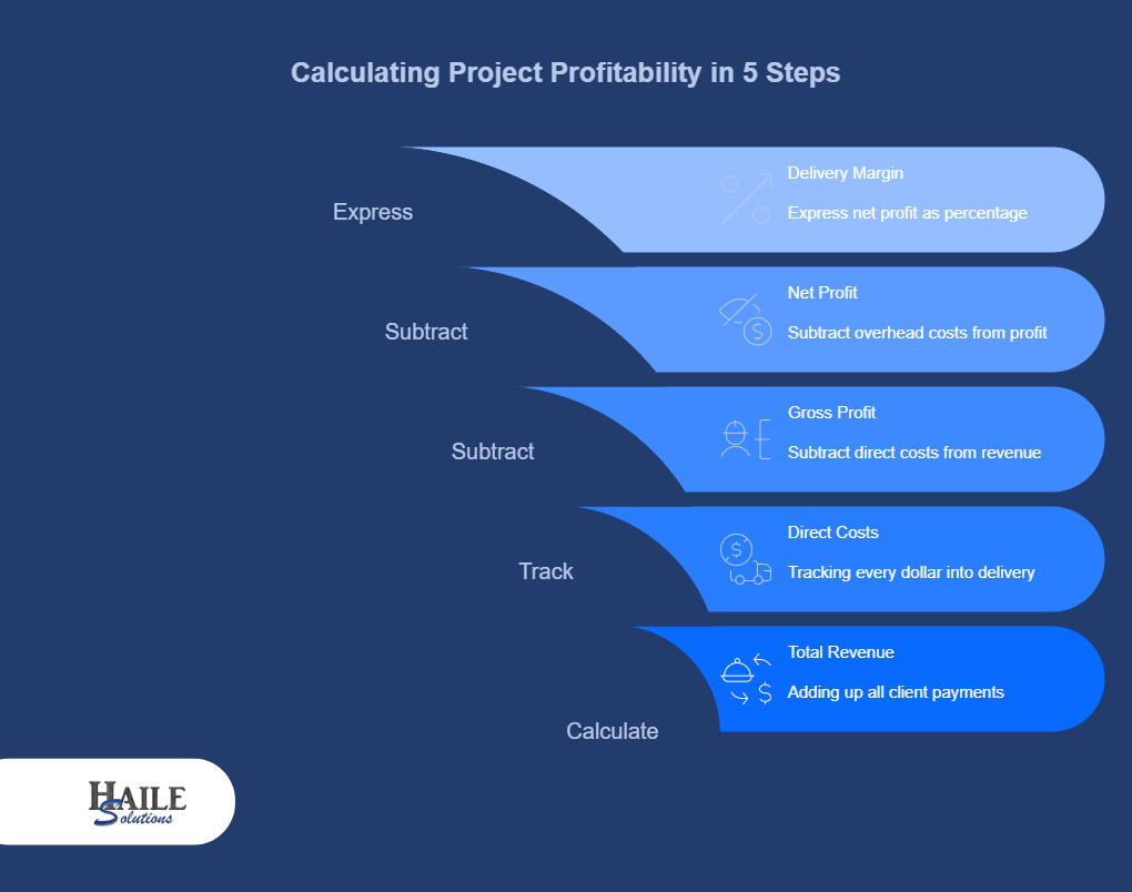 If you want something simple, use this 5-step process: (1) Calculate total revenue including all client payments, (2) Identify direct costs including labor, expenses, and supplier bills, (3) Calculate gross profit by subtracting direct costs from revenue, (4) Determine net profit by subtracting allocated overhead costs, (5) Calculate delivery margin as net profit divided by total revenue. This gives you a clear picture of each project’s financial contribution.